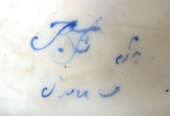 decorated with a blue border decorated with a stylised foliate gilt band and further plain gilt bands, the well painted with a sprig of pink roses, blue painted 'SF Sèvres' mark, 29cm wide; together with a matching plate, blue painted 'Sevres' mark with four dots beneath, 25cm diameter (2)