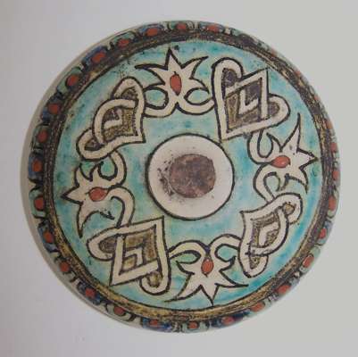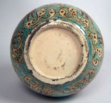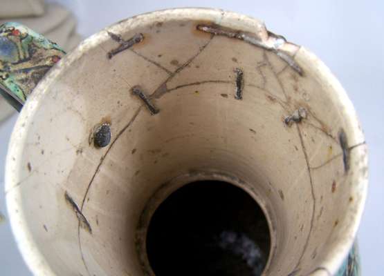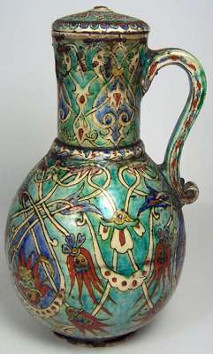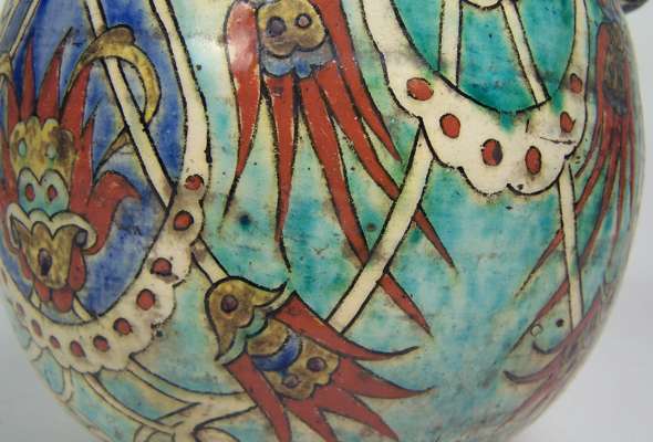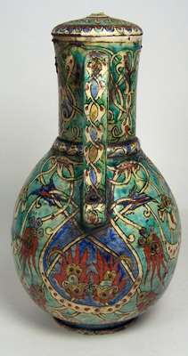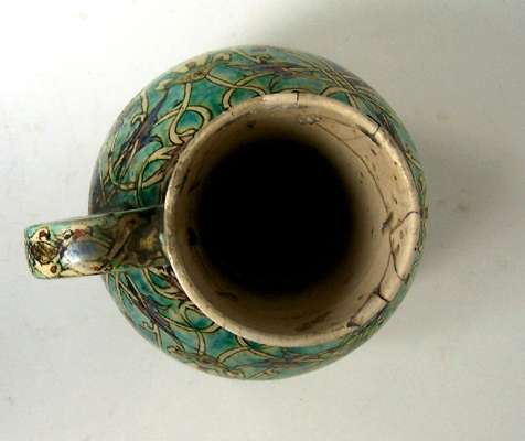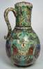 with cylindrical neck above ovoid body and scroll handle, decorated allover with stylised scrolling flowers and foliage on a green ground (damages)