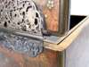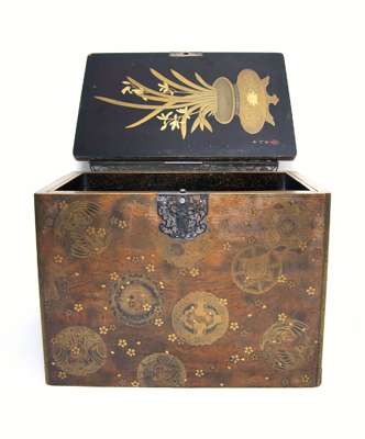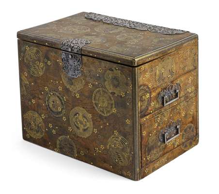 the gold lacquer medallions with lions, birds, lizards, flowers and butterflies, all on a birch veneer ground interspersed with small gilt lacquer flowerheads, fine silver mounts and handles to the two drawers, internally decorated with gold lacquer dust, the top cover opening to reveal a black lacquered tray, the inside decorated with a censer with lilies, signed Morikawa Saku