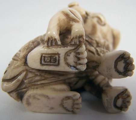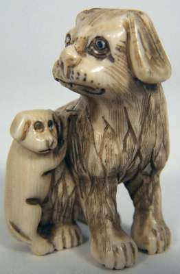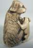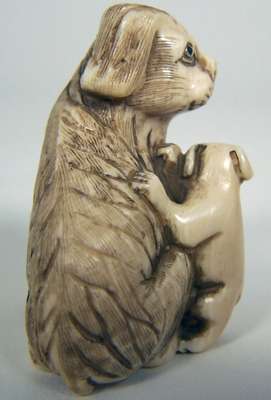 depicting a seated dog with her puppy climbing up her side, signed, later drilled to form a netsuke