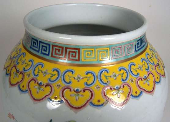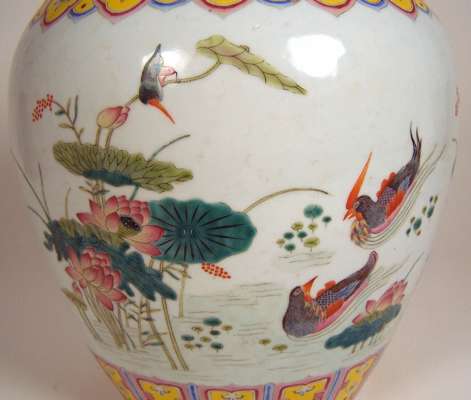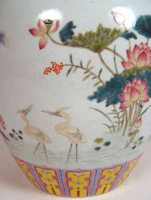 decorated with exotic ducks and waterlilies between geometric bands, red painted mark