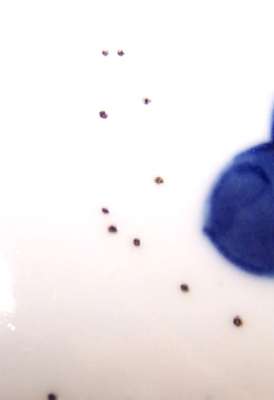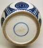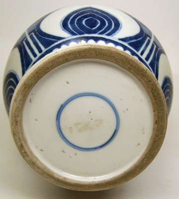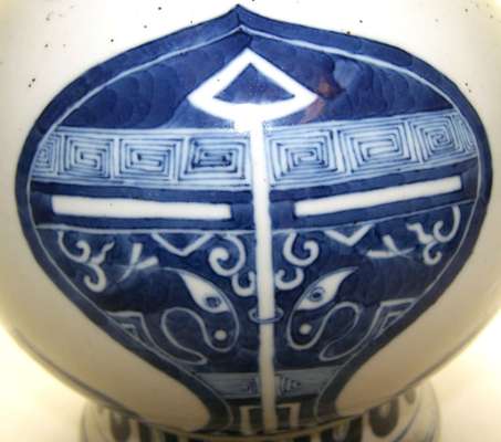 decorated with stiff leaves in geometric form, cloud scrolls above loop banding with four Tao Tieh mask panels, above stiff leaves and double blue concentric circle to base