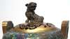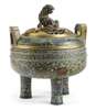 of circular form raised on three legs with two raised handles, the cover with brass centre pierced with bat forms and surmounted by a gilt bronze lion dog, the body decorated with bands of stylised flowerheads and scrolling foliage on a turquoise ground, seal mark to underside