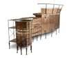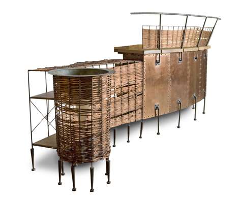 the shaped rectangular top of tubular steel superstructure with woven wire infill above a copper clad front with riveted decoration on steel feet, the whole with adjacent open shelving also with woven wire infill decoration, terminating in a corresponding cylindrical copper basin with verdigris finish, centred by a frosted glass vase