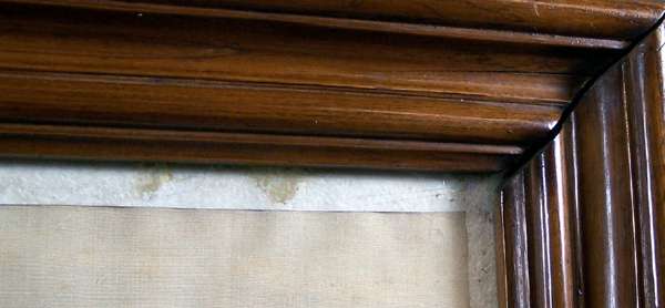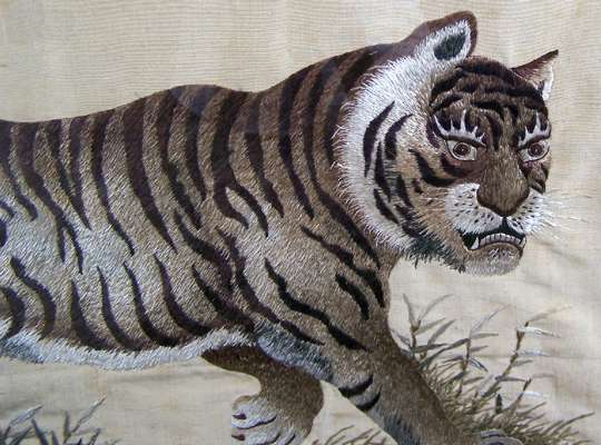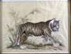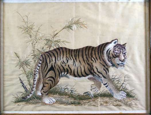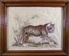 depicting a tiger stepping forwards from a bamboo plant, with grass and earth beneath his feet, glazed and within hardwood frame