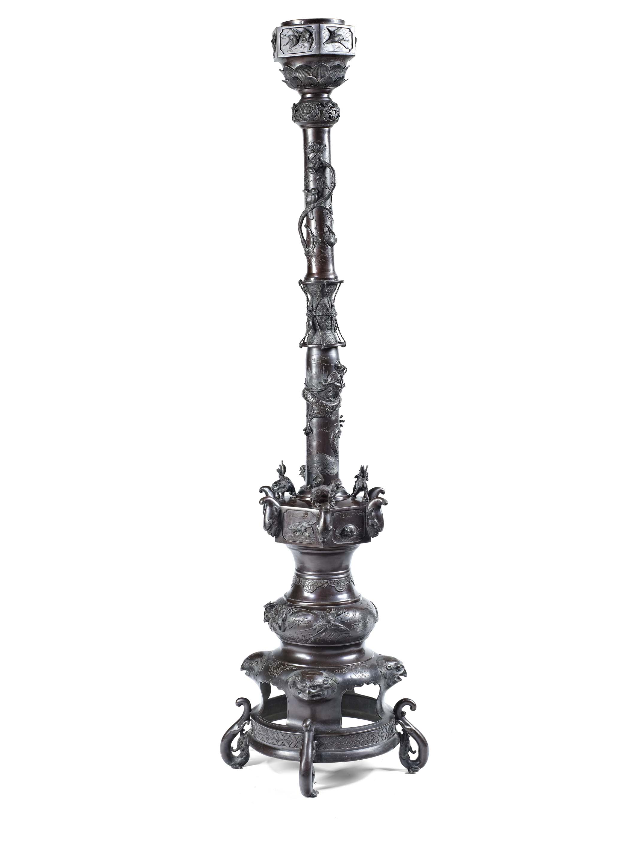 the relief cast stem decorated with exotic birds and foliage, raised on a hexagonal and baluster base surmounted by lion dogs, ending in dragon form scroll feet united by an openwork apron (electrified)