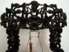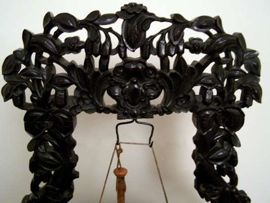 the circular bronze gong within ornate hardwood pierced foliate carved stand raised on four stylised mythical beast supports