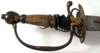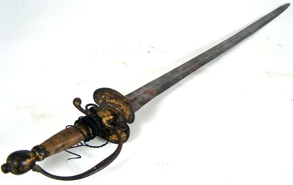 the wooden grip with loose binding, signed double edged replacement blade; a French bayonet; a blacksmith made iron hilted sword; a cast iron breast plate in the 16th century style; and two targes (6)