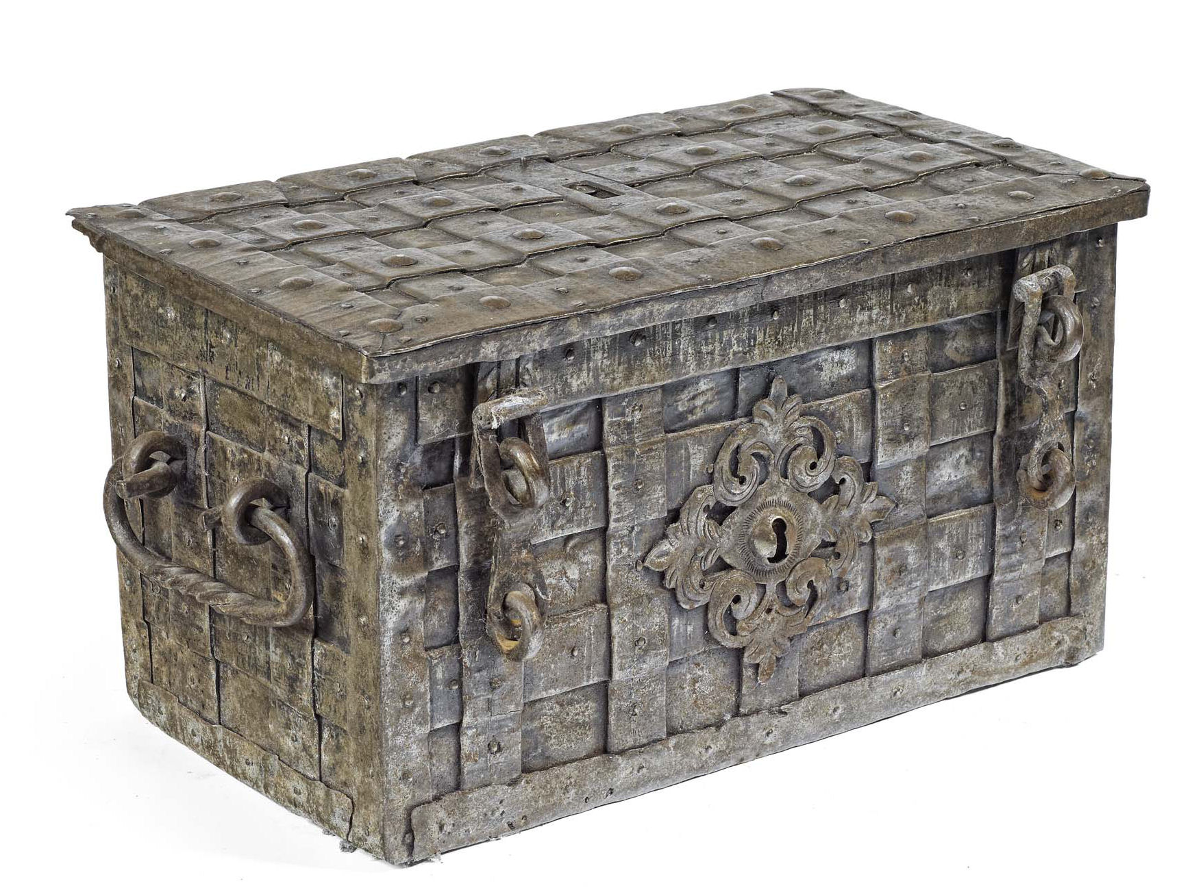 the studded strapwork rectangular sides with twin carrying handles, opening to reveal a ornate pierced lock plate, engraved with mermaids