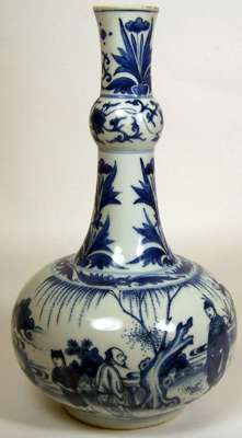each with tall knopped neck above globular body, decorated to the neck with bands of stylised flowers and the the body with a continuous figural and landscape frieze (restored) (2)
