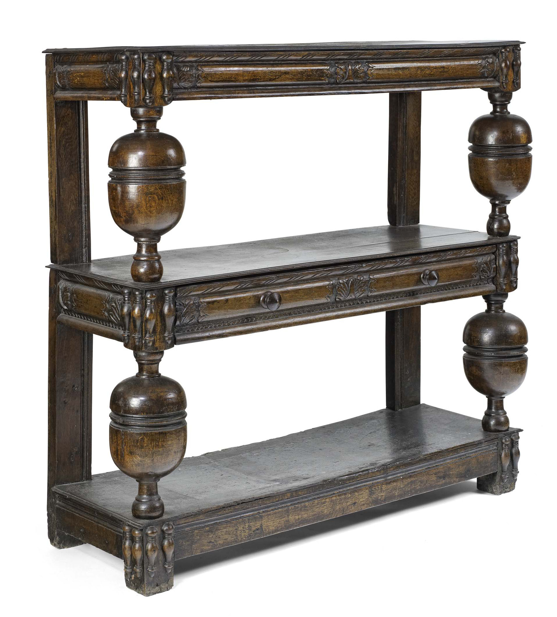 the moulded rectangular top above a foliate carved panelled ogee frieze, raised on bulbous cup and cover supports, the central tier fitted with one long drawer, raised on stile feet united by an under tier