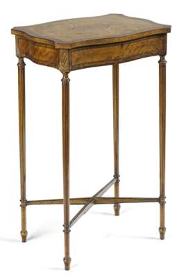In the Sheraton style, the crossbanded serpentine hinged lid enclosing a compartmented interior, raised on slender simulated fluted legs united by an X-stretcher