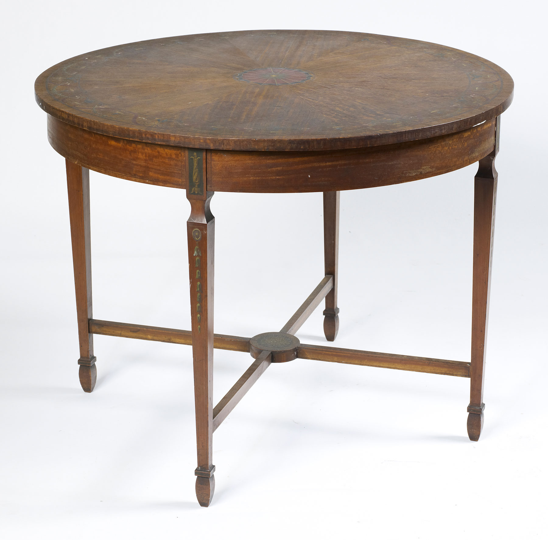 the circular top painted with a central fan motif and a foliate scroll border, raised on square tapered legs united by an X-stretcher