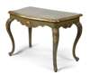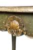 with serpentine front and sides and with gilt embellishments, the serpentine frieze with shell cartouche and beaded mouldings raised on leaf carved cabriole legs with scrolled feet