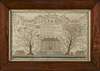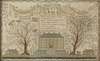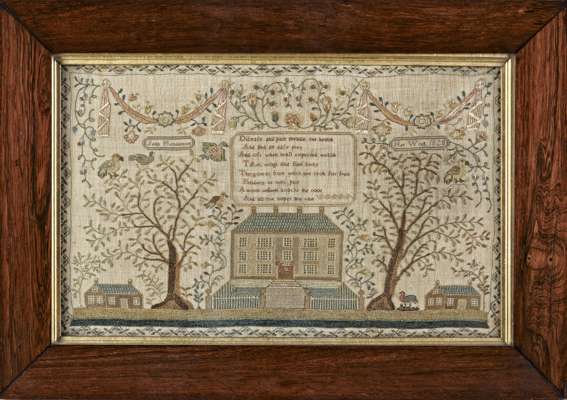 woven with central verse above a substantial house flanked by trees and smaller cotages, cloth swags above, in rosewood frame with giltwood slip