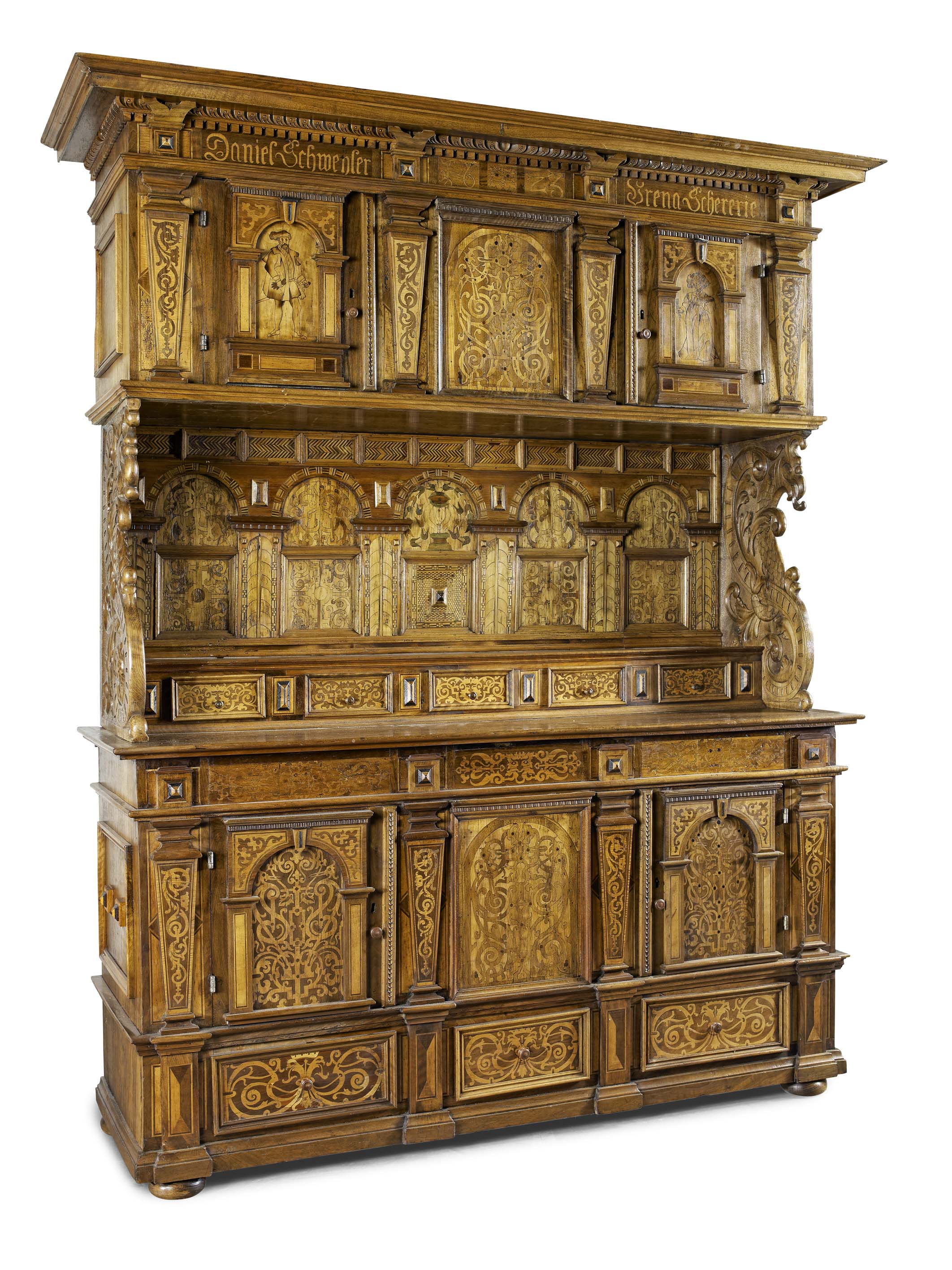 inlaid throughout with scrolling foliage, the dentil cornice above a panelled frieze inlaid with script and a pair of arched panel doors inlaid with traditional figures, flanked and divided by architectural pilasters, above an multi-arched panel open shelf with five small drawers, the lower section with two further arched panel cupboard doors and three apron drawers, raised squat bun feet