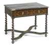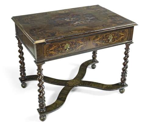 the moulded rectangular top inlaid with foliate scroll panels, above a seaweed marquetry frieze drawer, raised on a spiral turned legs united by a wavy X-stretcher
