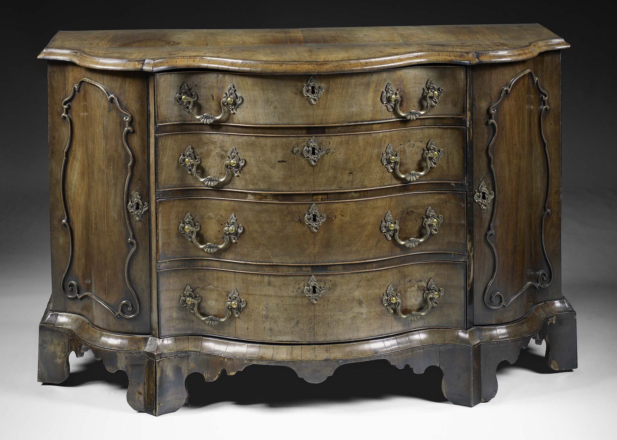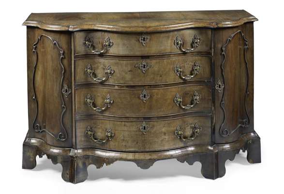 after a design by Thomas Chippendale, the shaped moulded top above four long graduated drawers, flanked by panelled cupboard doors, raised on bracket feet united by a shaped apron