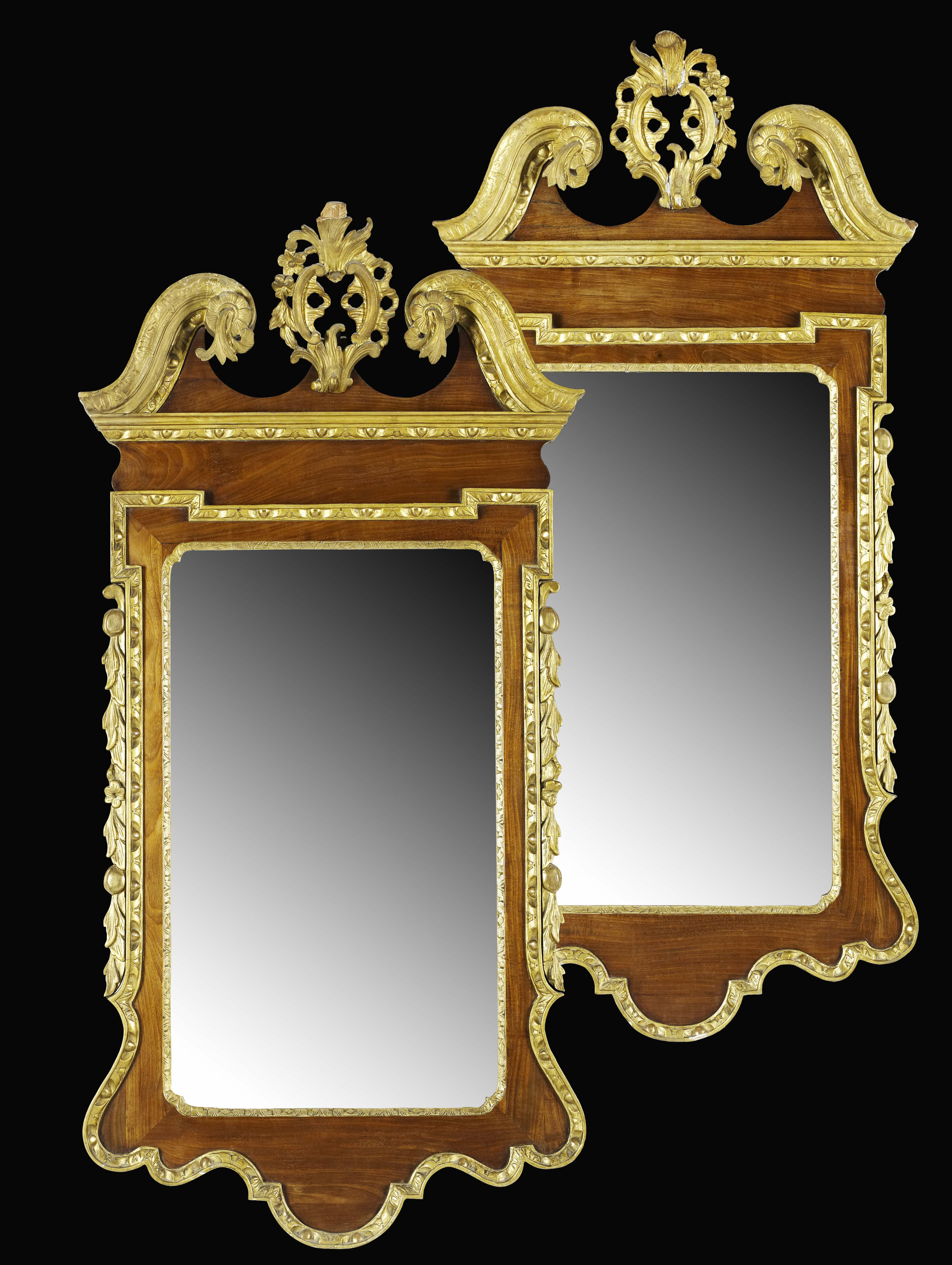 PAIR OF GEORGE II WALNUT AND PARCEL GILT WALL MIRRORS