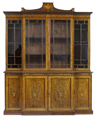 GEORGE III MAHOGANY AND INLAID BREAKFRONT LIBRARY BOOKCASE