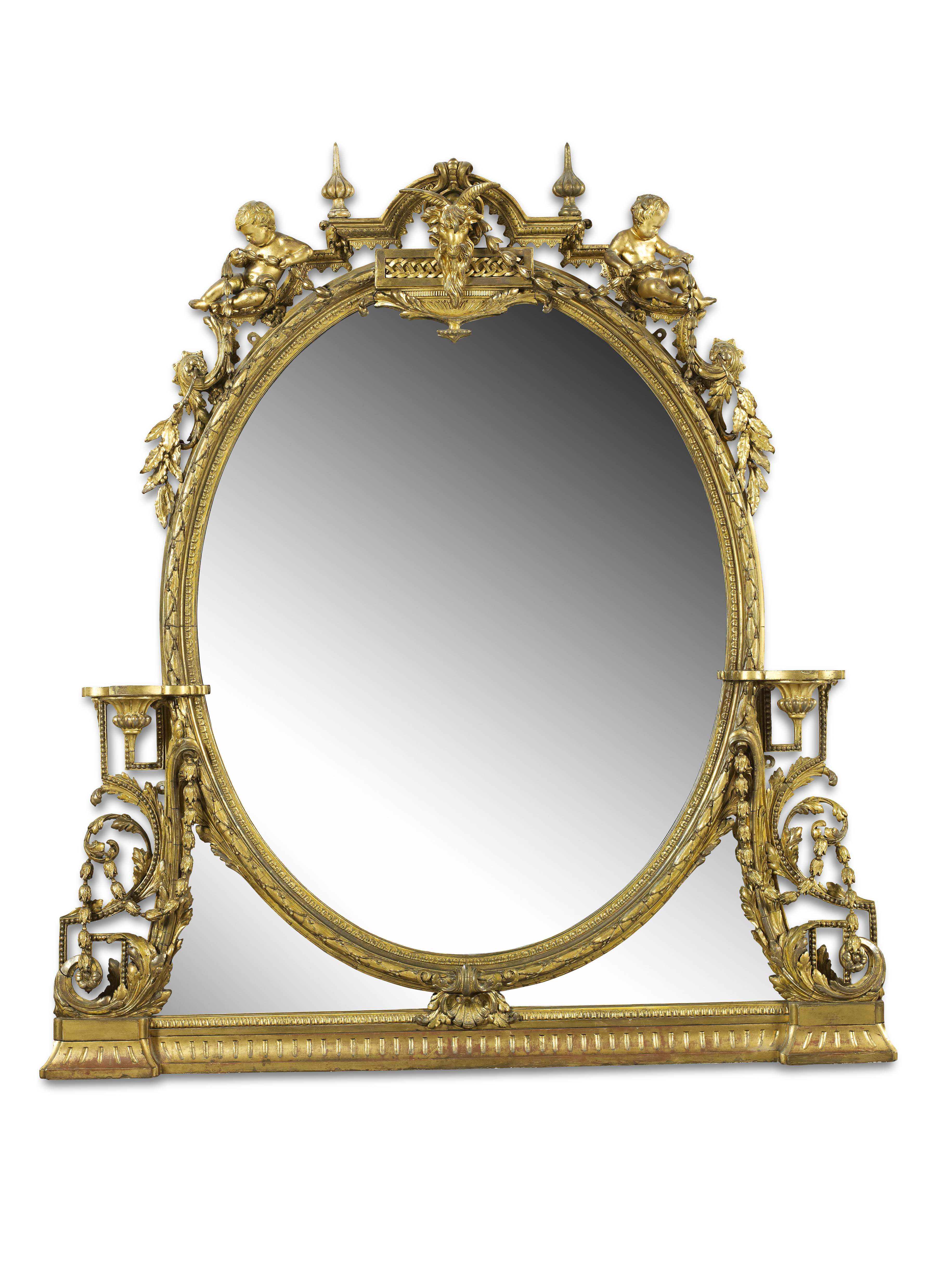 the oval plate within a laurel leaf frame, surmounted by a ram's mask cresting flanked by cherubs, united by trailing bellflower swags, the shaped apron with two margin plates surmounted by two shaped tiers