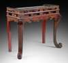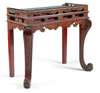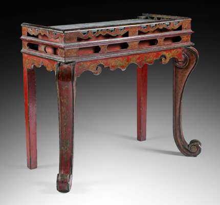 the three quarter pierced two tier gallery with foliate and trellis decoration, the serpentine shaped apron with further chinoiserie decoration, raised on outset cabriole scroll legs