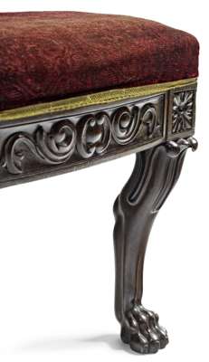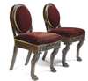 the reeded oval padded backs and stuffed over seats covered in red velvet, above foliate carved aprons, raised on cabriole legs ending in paw feet and surmounted by patera motifs (2)