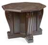 the octagonal top raised on a panelled X-form base with scroll carved supports
