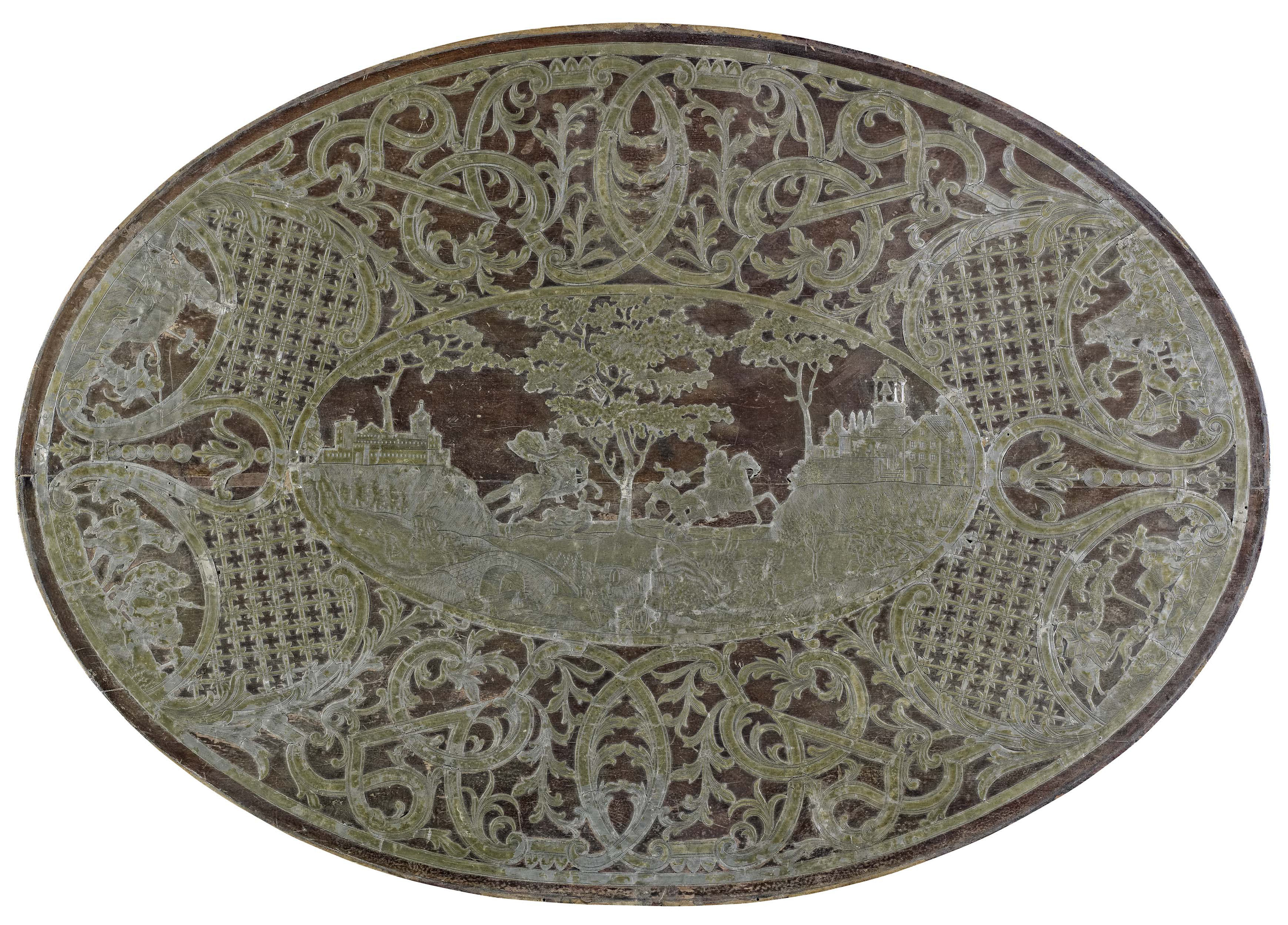 depicting a battle scene with knights on horse back in a wooded and architectural landscape within a wide foliate and trellis work border