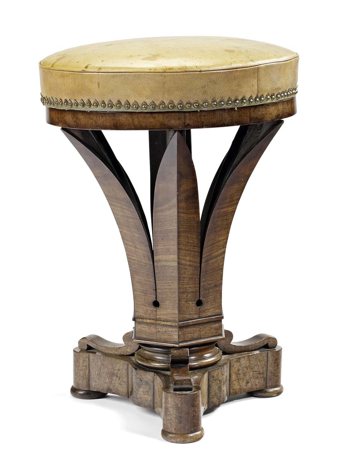 the circular height adjustable seat covered in studded tan leather, the tapered column support formed as stylised stiff leaves, raised on a triform platform base with squat bun feet