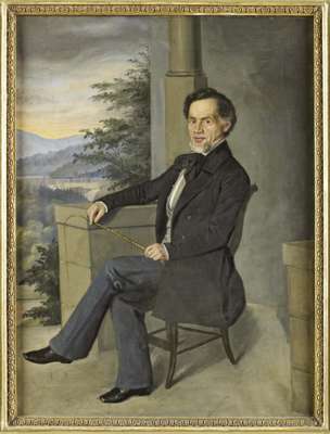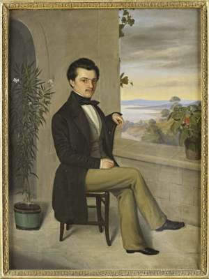 SEATED PORTRAIT OF A YOUNG MAN WITH AN EXTENSIVE LANDSCAPE BEYOND