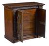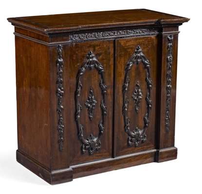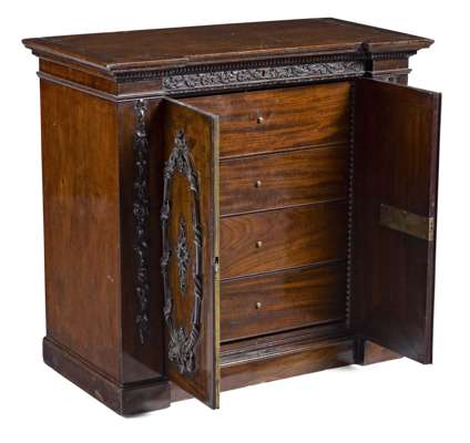 of inverted breakfront form, the dentil cornice above foliate carved frieze and two cupboard doors, each carved in high relief with oval acanthus wreaths, opening to reveal a fitted interior with four compartmented drawers, raised on a moulded plinth base