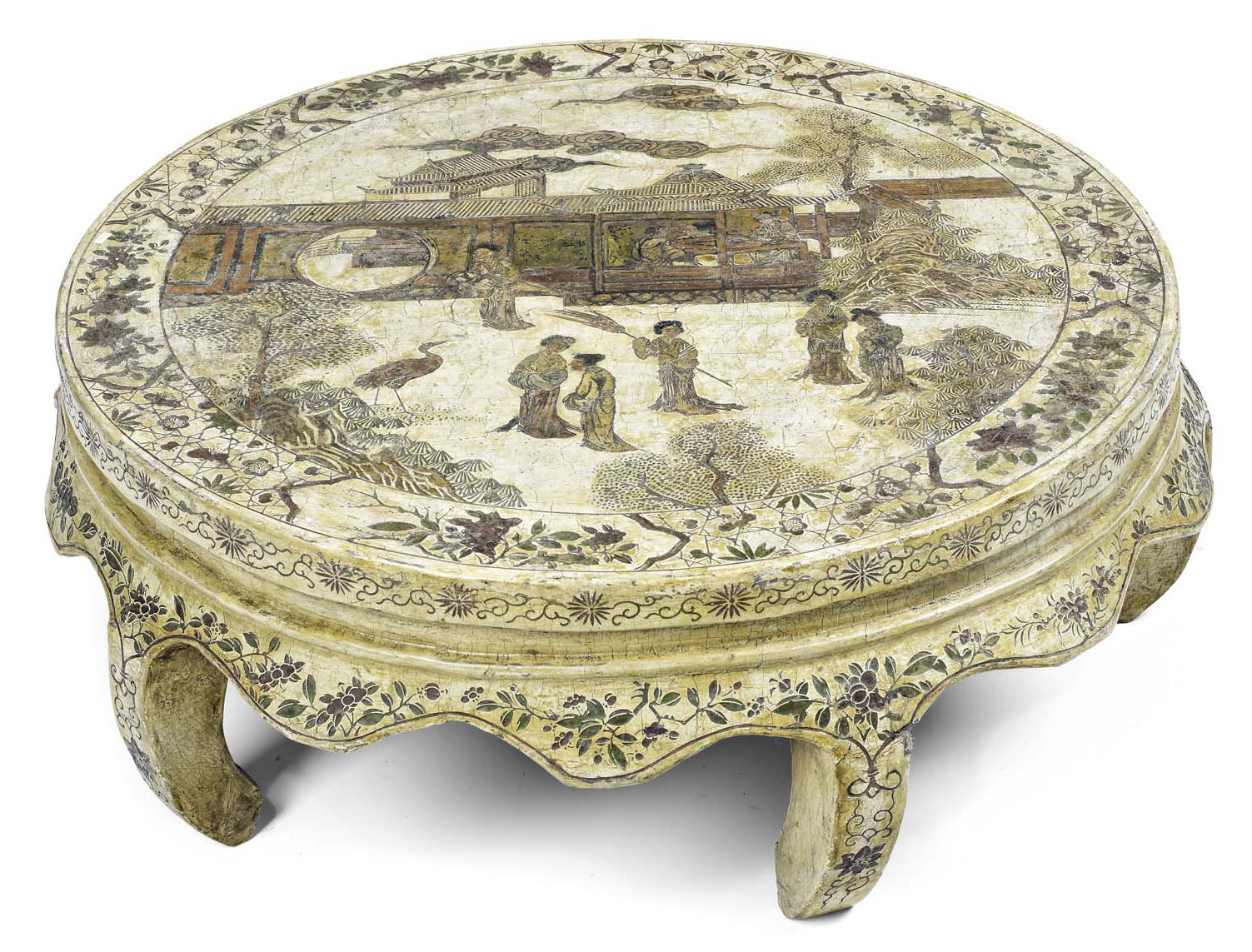 the circular top decorated with pagado and figures engaged in various pursuits, riased on five concave scroll legs united by a foliate decorated undulating apron