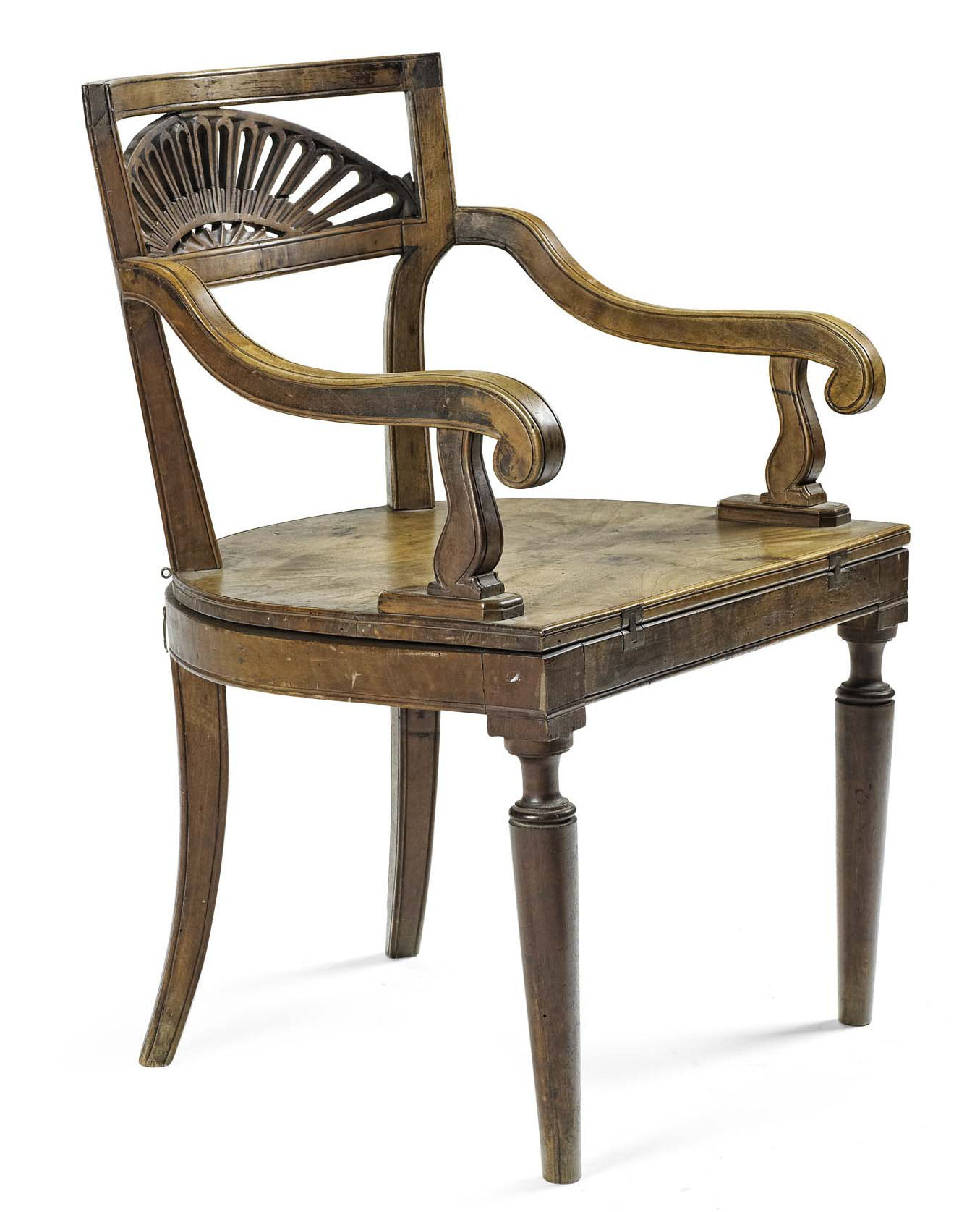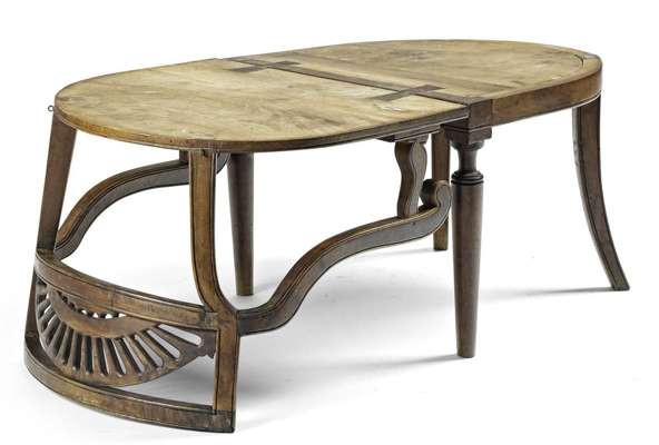 the curved bar back with a pierced demi-lune fan shaped splat with down scrolling arms and shaped solid seat raised on turned tapered legs, the whole opening to reveal an oval table