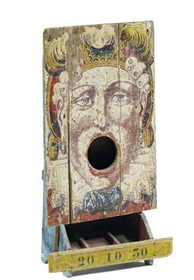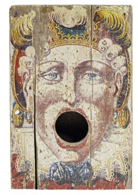 the rectangular board modelled as a male mask, his mouth cut with a circular aperture, the moulded apron with numbered scores