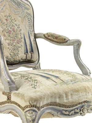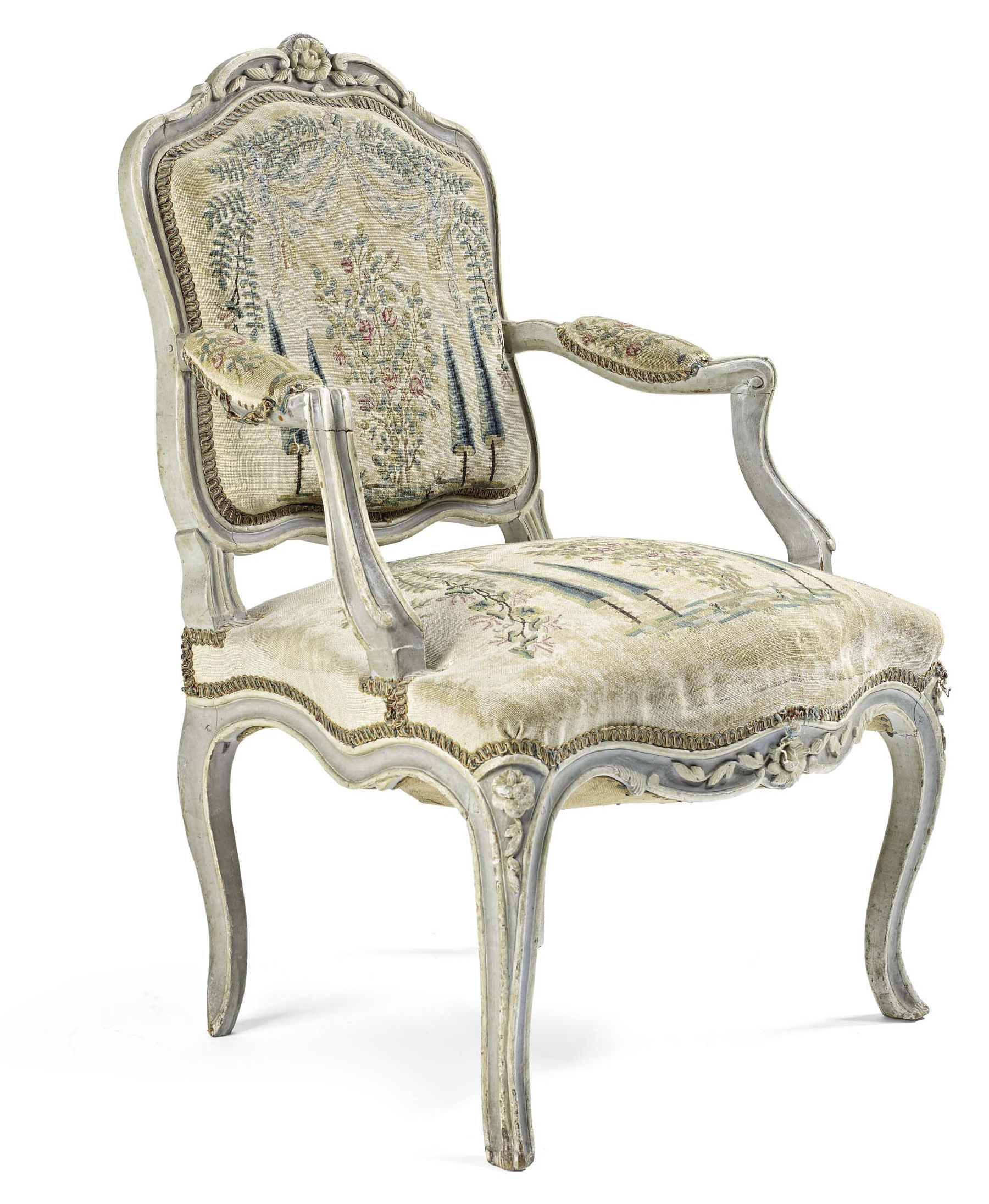 LOUIS XV PROVINCIAL GREY PAINTED AND TAPESTRY UPHOLSTERED FAUTEUIL