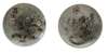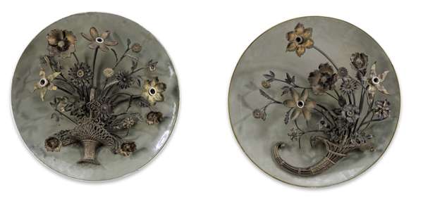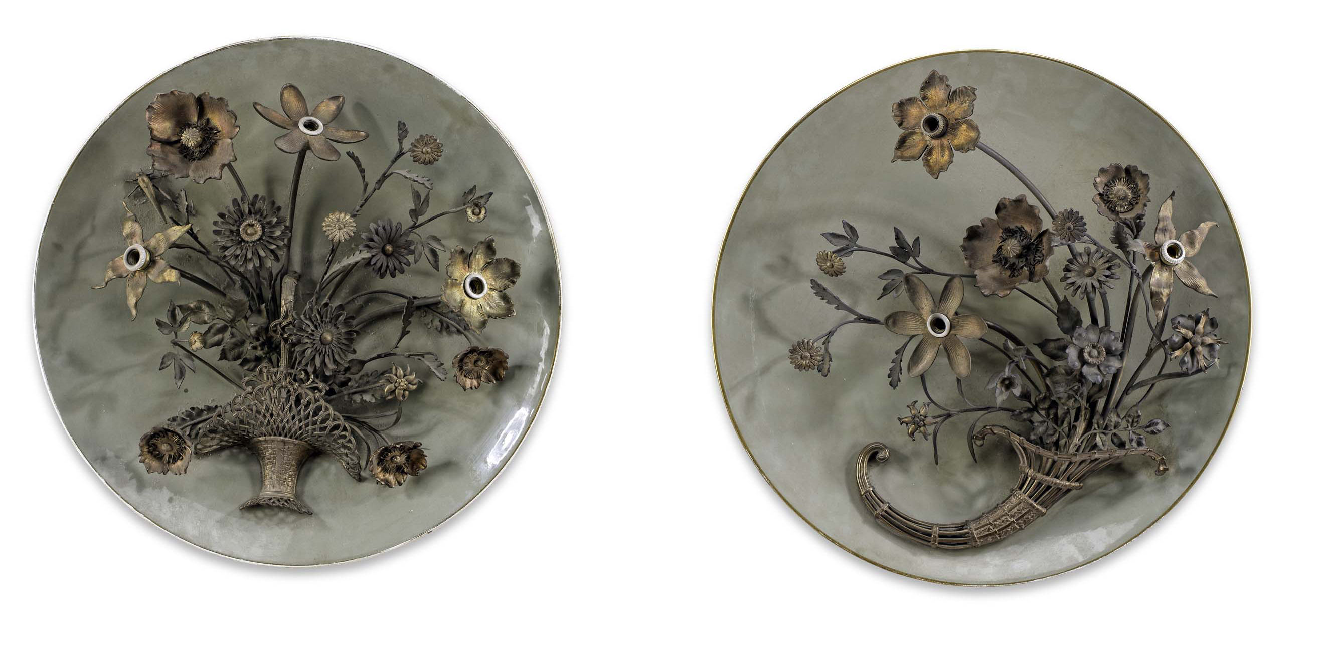 the circular chargers mounted with a flowering basket, the other a cornucopia from which issues three outscrolling candle arms, electrified, impressed AHT 479 (2)
