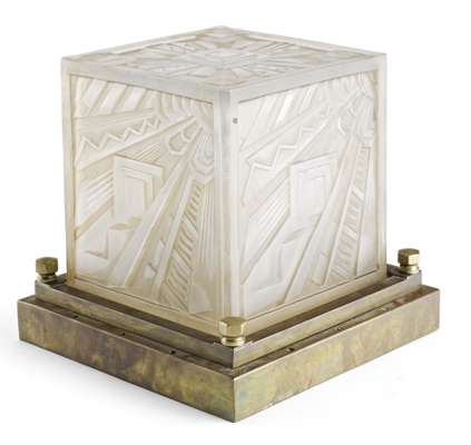 the square acid etched sides decorated with stylised flower heads, sunburst and geometric motifs, raised on a rectangular base