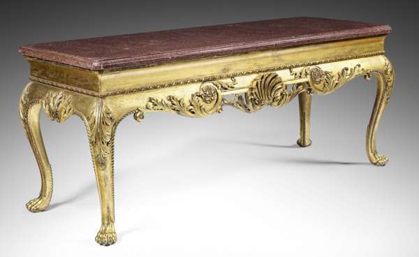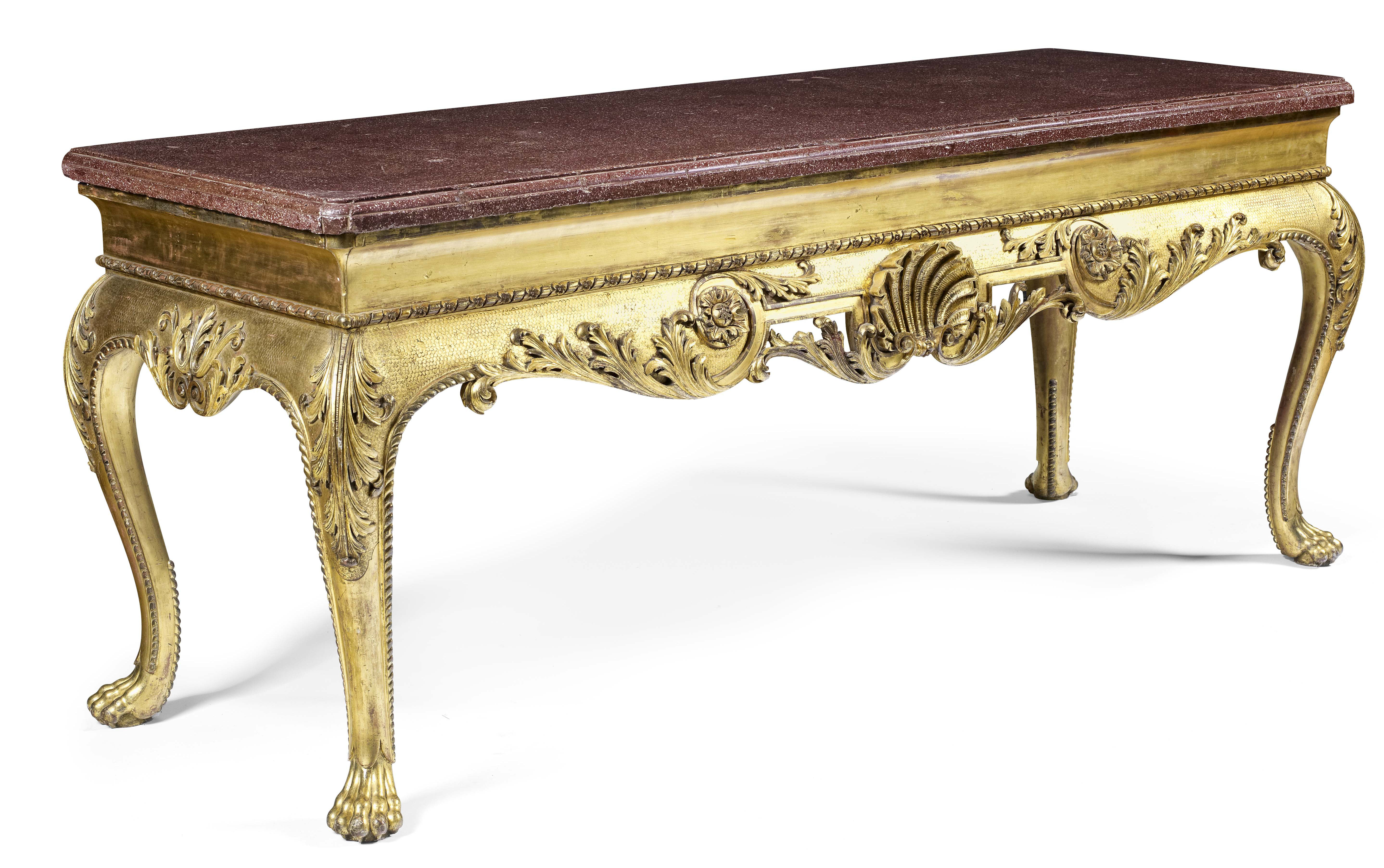 IMPRESSIVE GEORGE II STYLE CARVED GILTWOOD AND FAUX PORPHYRY CONSOLE TABLE