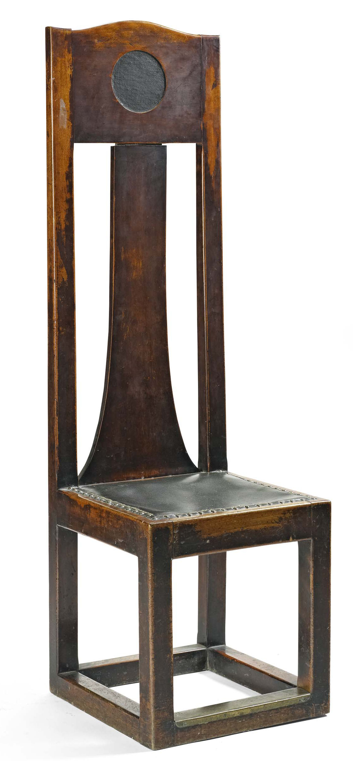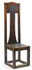 with shaped top rail above tall tapered splat and upholstered panel seat, raised on square supports linked by stretchers