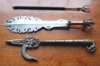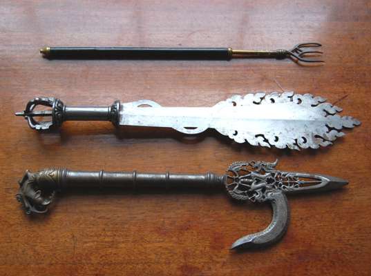 the pierced face decorated with entwined grotesque figures, with brass lion finials, 39cm high; a late 19th century brass mounted toasting fork, 38cm high; and a 19th century polished steel Tibetan ceremonial dagger or Phurba with open crown finial on stand, 43cm high (3)