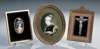 depicting a young woman with lacework embroidered hat, a trailing veil and a fur lined cape, looking to her left within velvet lined oval gilt frame
