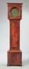 the twin train movement with anchor escapement striking on a bell, the circular brass dial with Roman chapters and subsidiary seconds dial and date aperture, the moulded and dentilled cornice above fluted columns and shaped trunk door enclosed by reeded quarter columns and panelled base raised on bracket feet