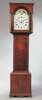 the twin train movement with anchor escapement striking on a bell, the arched enamel dial with subsidiary seconds dial and date aperture and moonphase to the arch, the hood with projecting cornice and turned columns above trunk with blind fret angles and panelled base