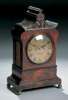 the twin train fusee movement, with circular brass dial and Roman chapters enclosed within case with leaf carved pagoda surmount above an ogee base on plinth with brass ball feet