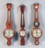 with boxwood and ebony stringing, the swan neck pediment above a shaped case fitted with dry/damp dial, thermometer, circular silvered dial and convex mirror with level below