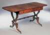 the rectangular top with rounded drop-flap ends and purplewood banding above frieze with opposing drawers, raised on scrolled trestle supports with turned roundels joined by turned stretcher, on sabre legs with brass caps and castors