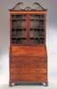 with boxwood stringing, the pierced swan neck pediment with satinwood frieze above pair of astragal glazed doors enclosing adjustable shelves, the bureau with fallfront enclosing fitted interior above four long boxwood cockbeaded drawers and lopers, on shaped bracket feet