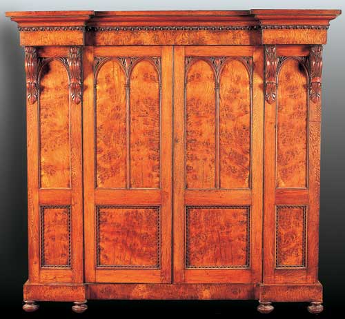 the reverse breakfront moulded cornice above a pair of doors with lancet arched gothic panels above egg and dart moulded panels enlosing an interior fitted with drawers and sliding shelves, flanked by similar panels with leafy scrolling bracket supports and sides with opposing panelled doors enclosing hanging space, raised on a plinth with flattened bun feet