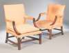 with upholstered serpentine back and seat, the open arms with leaf carved downswept supports, on fluted square section legs joined by H-stretcher